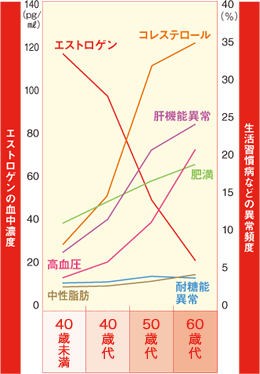 「女性ホルモンは、コレステロールの増加を抑えたり、骨からカルシウムが減らないようにする働きがありますから、更年期は高血圧、脂質異常症、糖尿病に注意が必要。また更年期以降には、骨粗しょう症やアルツハイマー、尿失禁などになりやすいので注意が必要です」