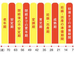 「女性は7年ごとに身体が変化する」。そんな話を聞いたことがある人もいるのでは。東洋医学では、女性は7年周期で体調に変化があると考えられています。女性の一生とエストロゲン分泌量の変化と、重なる部分も多くあるのがわかります。東洋医学の考えでは、63歳から70歳が安定期。閉経に身体が慣れ体調が安定する時期だと考えられています。日本人女性の更年期症状も、数年で落ち着くことが多いようです。