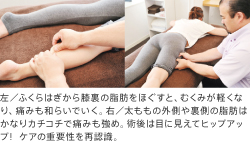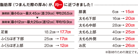施術は脂肪をほぐしながら筋膜へのはりつきをはがすことが目的。横に張った太ももやデスクワークであまり動かすことのない膝の裏側など、脂肪が硬い部分は刺激を感じやすい場所だそう。手の力だけで、脂肪をほぐすこと30分。施術前とは明らかに脂肪の感触に変化が現れます。部分ごとに差が大きかった脂肪の厚みも、終わる頃には均一に近い結果が。むくみやたるみも改善され、いかに脂肪がはりついていたかを実感。そして、何よりも驚いたのは自分の身体が予想以上にゆがんでいたこと。施術によって気になる膝の痛みも緩和しました。