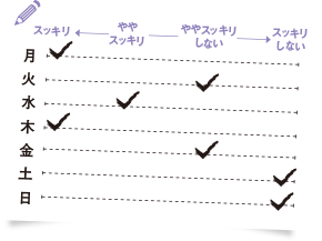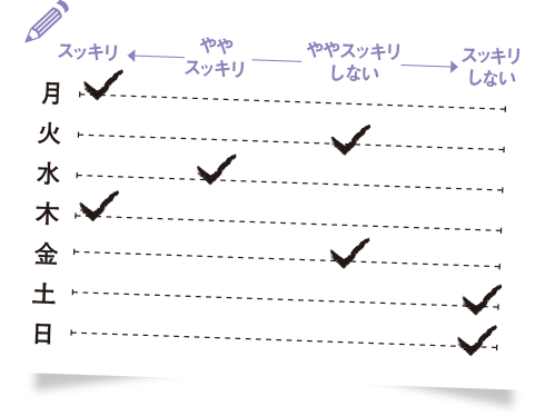 毎朝基礎体温を記録するように、睡眠による疲労回復度をチェックしてみましょう。下にあるような表を作り、すっきり目覚められたかどうか、その度合いを毎朝書き込みます。目覚めてすぐの、ぼんやりしている状態で行うのがベスト。その日の予定が頭によぎると感覚に影響が出るからです。すっきり目覚められなかった日が続いている場合は、仕事や運動などをがんばり過ぎている証拠。疲れが回復しきれていないということなので、仕事や運動などを少し控えるようにしましょう。