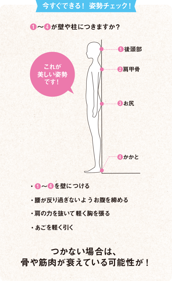 10代~30代の姿勢の悪さは、多くの場合が、猫背などクセによるものだそうですが、40代以降は、骨や筋肉の衰えによって、身体を支えづらくなっていることのほうが多いそう。つまり、猫背など、クセによるものだと思っているうちに、次第に自分の力で姿勢を正せなくなっていくのだそうです。