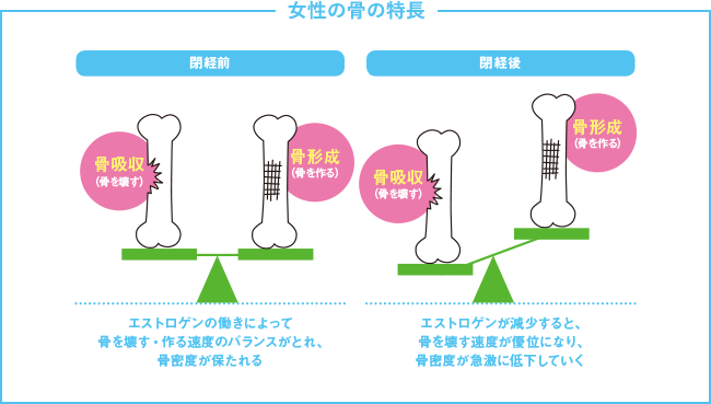 「骨粗しょう症は、圧倒的に女性に多い病気。男性の約3倍です。なぜかというと、女性ホルモンが関係しているからです。女性ホルモン・エストロゲンには、古い骨を壊す【骨吸収】を穏やかにして、骨の健康を維持する働きがあります。しかし閉経前後からエストロゲンの分泌が減少するため、【骨吸収】が異常に早くなり【骨形成】が追いつかなくなってしまうのです」