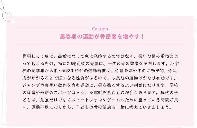 「骨粗しょう症の発症率は、50歳後半から急激に増加しますが、決して若い人に関係のない病気ではありません。骨密度の低下に備えて、骨を蓄えておかねばならないのです。女性の骨量は、20歳前後の骨量と閉経後の影響だけで決まると思ってください。骨量が最も多くなる20歳前後までにできるだけ増やし、閉経後はできるだけ減らさないようにすることが大事です」