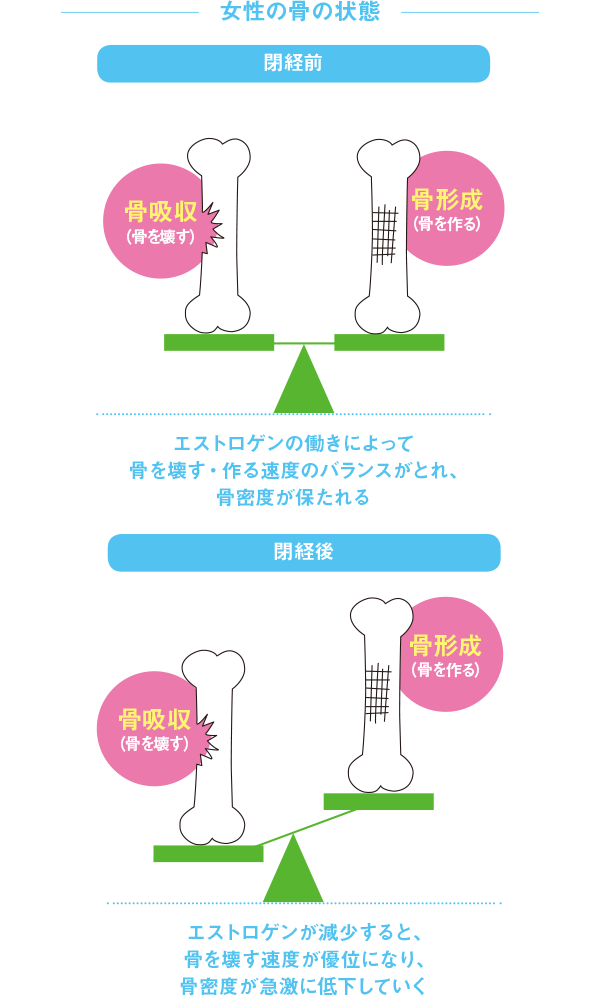 「骨粗しょう症は、圧倒的に女性に多い病気。男性の約3倍です。なぜかというと、女性ホルモンが関係しているからです。女性ホルモン・エストロゲンには、古い骨を壊す【骨吸収】を穏やかにして、骨の健康を維持する働きがあります。しかし閉経前後からエストロゲンの分泌が減少するため、【骨吸収】が異常に早くなり【骨形成】が追いつかなくなってしまうのです」
