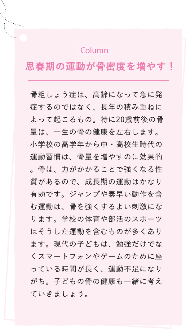 「骨粗しょう症の発症率は、50歳後半から急激に増加しますが、決して若い人に関係のない病気ではありません。骨密度の低下に備えて、骨を蓄えておかねばならないのです。女性の骨量は、20歳前後の骨量と閉経後の影響だけで決まると思ってください。骨量が最も多くなる20歳前後までにできるだけ増やし、閉経後はできるだけ減らさないようにすることが大事です」