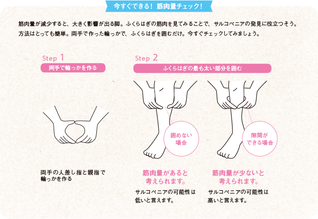 「先の患者さんのように、支えてあげないと真っ直ぐに立てないようになってしまうと、運動することさえ難しくなってしまいます。そういった、筋肉の衰えや減少によって運動機能が低下した状態をサルコペニアと言います。筋肉が少ないと運動をしてもすぐに疲れますから、なかなか運動ができない。それによって筋肉がさらに減少する。その繰り返しからサルコペニアが起こるのです。実は、筋肉量が減少すると、まず脚に大きく影響が出ることがわかっています。歩くのが困難になってしまうと、生活のあらゆることが不自由になっていきます」