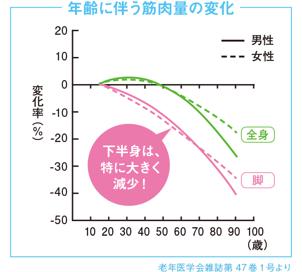 もともと少ない、つきにくい。ついても落ちやすい。そこに加齢が加わると、加速度的に筋肉は衰えていきます。年を重ねるごとに疲れやすくなるのには、筋肉の減少も関係しているのです。