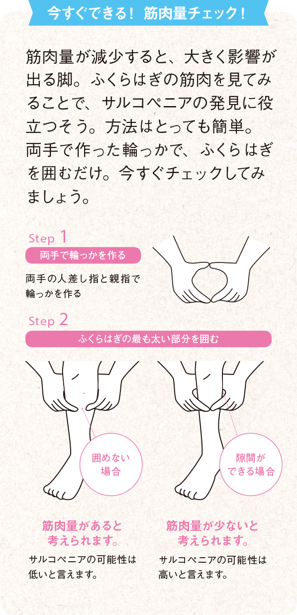 「先の患者さんのように、支えてあげないと真っ直ぐに立てないようになってしまうと、運動することさえ難しくなってしまいます。そういった、筋肉の衰えや減少によって運動機能が低下した状態をサルコペニアと言います。筋肉が少ないと運動をしてもすぐに疲れますから、なかなか運動ができない。それによって筋肉がさらに減少する。その繰り返しからサルコペニアが起こるのです。実は、筋肉量が減少すると、まず脚に大きく影響が出ることがわかっています。歩くのが困難になってしまうと、生活のあらゆることが不自由になっていきます」