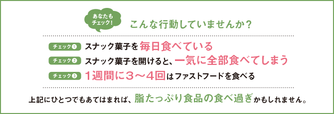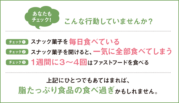 ファストフードや油で揚げたスナック菓子、生クリームたっぷりのケーキ。コンビニエンスストアやスーパーに行くと、買うつもりはなかったのについ手が伸びてしまった、という経験はありませんか? 手軽にすぐ食べられることもあって、仕事中や家事をしながら、テレビを見ながらなど、つい食べてしまうことは多いですよね。しかも、最初はちょっとだけのつもりが、知らず知らずのうちにいつの間にかひと袋全部食べてしまっていたり……。