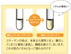 「糖化は肌を老化させる大きな原因のひとつで、肌に悪影響を与えるまさにキレイを目指す人の敵。くすみは、肌のハリや弾力を生み出すコラーゲンが糖化することでも起こるのです。コラーゲンや角質のケラチンはもともと透明なのですが、糖化すると右下図のように黄色や茶褐色に変化してしまいます。この色の変化が肌の内側で起こり、くすみにつながっていくのです」と、糖化に関する研究や著書で知られる久留米大学教授の山岸昌一先生。糖化という言葉が難しく感じる人も多いかもしれませんので、わかりやすくするために、ホットケーキに例えてみましょう。