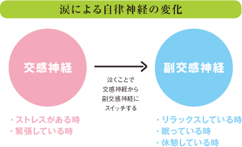 「この交感神経の緊張をゆるめて、ストレスを解消するには、余計なことは考えずに眠ってしまうことです。眠ると自然に副交感神経にスイッチが切り替わり、気分がリラックスします」と有田先生。そして興味深いのが、眠ること以外に副交感神経へとスイッチを切り替えるただひとつの方法が、“情動の涙”を流すことなのだそうです。