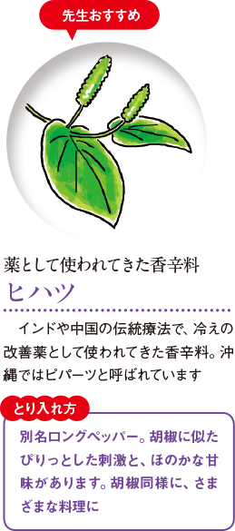 「血管に巻きつくようにある、壁細胞がはがれることによって血管は不安定になり、血液に含まれる栄養などが漏れ出るようになります。輸送機関として機能する健康な血管を作るには、壁細胞をはがれにくくすること。そのために活躍してくれるのがTie2(タイツー)という分子。壁細胞と内皮細胞をぴったりと密着させる接着剤のような働きがあります。近年、そのTie2を活性化させる植物があることがわかってきました。中にはあまりなじみのないものもありますが、比較的手に入れやすく、摂り方がわかりやすいものを紹介します。おすすめはヒハツ。Tie2を活性化する力が、特に高いことがわかっています。胡椒に似た風味がある香辛料で、使いやすいと思います。Tie2活性素材は、毎日摂るのはNGです。慣れてしまうとその効果が薄れてしまうからです。とり入れるのは週に2~3回を目安に、健康な血管作りに役立てましょう」