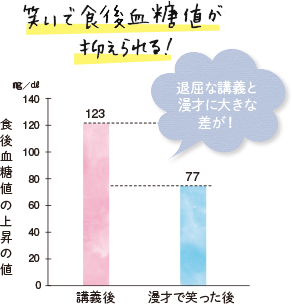 筑波大学の村上和雄名誉教授が行った実験。2型糖尿病患者19人を対象に、退屈な講義と大笑いできる漫才をそれぞれ40分聞いてもらい、食後2時間の血糖値を比較。漫才のほうが、食後血糖値の上昇の値が低いという結果に。