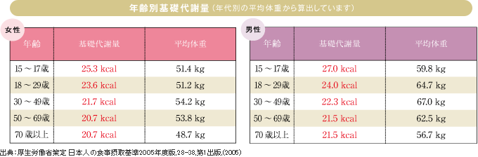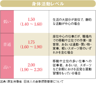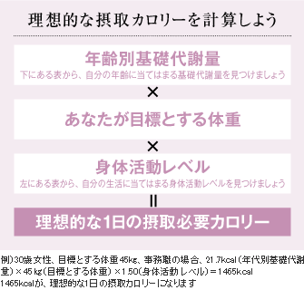 下の表を参考にしながら、自分にとっての理想的な摂取カロリーを考え、1日の食事を見直してください。「腹七分目」を目安に、カロリー控えめでバランスのよい食生活を心がけましょう。