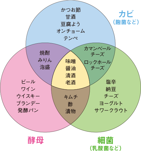 発酵食品を生む主な微生物は、酵母、カビ、細菌。