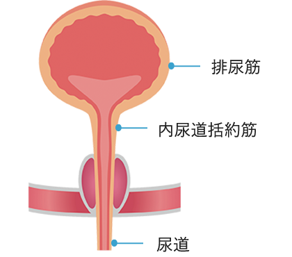 膀胱の内側にある排尿筋という筋肉が柔軟にふくらむことで尿を溜め、内尿道括約筋が締まることで尿が外に漏れないように止めています。尿意を感じると、排尿筋がぎゅっと縮んで尿を押し出し、内尿道括約筋がゆるんで外へ出されます。膀胱の筋肉が硬くなると、溜める・出すがスムーズにできなくなります。