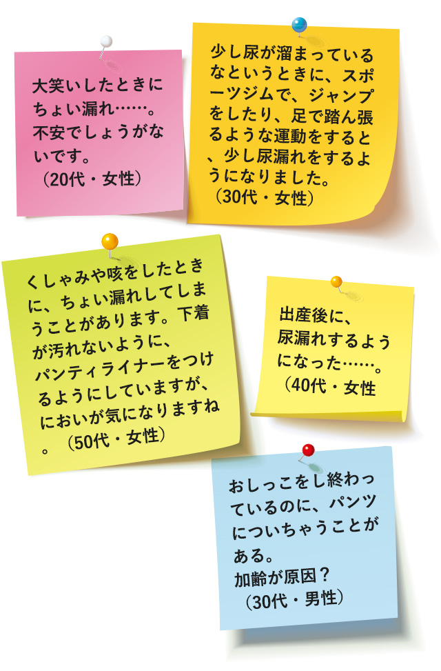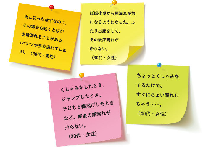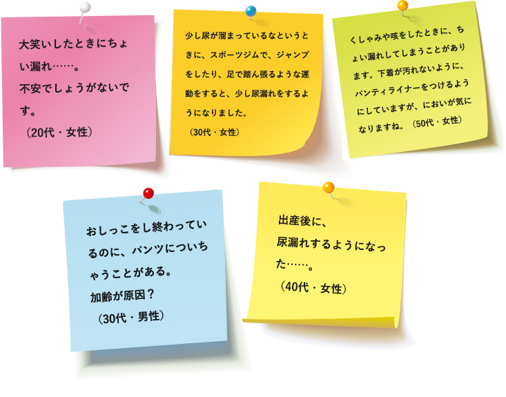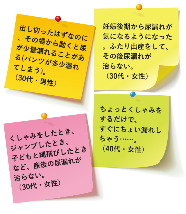 “おしっこがちょっと漏れる”という悩みは、女性からも、男性からも挙がってきました。特に多かったのは、不意にくしゃみが出たときや、大笑いしたときなどに少しだけ漏れてしまう、いわゆる“ちょい漏れ”。出産を経験した女性からの声が多く見られました。