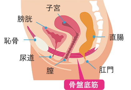 その名の通り、骨盤の底にある筋肉のこと。骨盤内にある膀胱や子宮、直腸の重みを支えると同時に、排せつのコントロールを担っています。