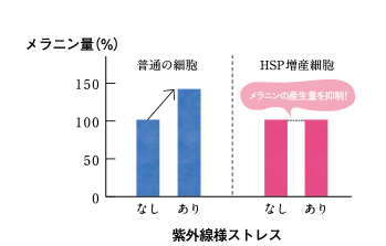 メラニンを作る細胞のメラノサイトを培養し、メラニン産生量を調査。普通のメラノサイトと、HSPを増産したメラノサイトに紫外線と似たストレスを与えた結果、HSPを増産したほうの産生量はほとんど増えませんでした。つまり、HSPが多いほどメラニン産生を抑制し、シミの発生を抑えることがわかりました。