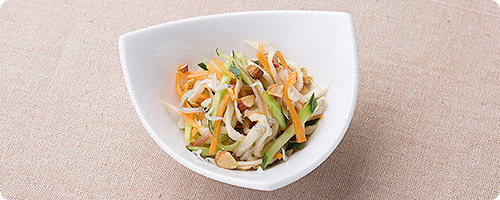 切り干し大根はその名のとおり、切った大根を干したもの。簡単に手作りもできる便利な食材ですが、干すと生の大根に比べて栄養価が非常に高くなるんです!干し大根を水戻しすると約4倍になるので、大根の生100gと干し25gの栄養価を比べてみると、なんとビタミン・ミネラル類が約3倍に。単に水分が抜けただけではなく、栄養素が増えています。こんな栄養豊富な切り干し大根にきゅうりやみょうがを加えてさわやかさと彩りをアップ。さらに、ビタミンB群、Eやミネラルもたっぷりのアーモンドをプラスすれば、栄養面だけでなく、カリッとした食感がアクセントになって、さらに箸が進みます。