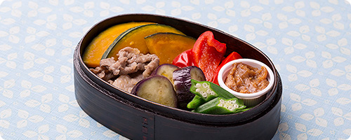 今回のお弁当は食欲がない時でも食べたくなる、酸味のある「すし飯」。ツナや卵のそぼろをのせて食べやすく仕上げました。さらに、新鮮なピーマンやモロヘイヤなどの夏野菜はビタミン類の宝庫。特にモロヘイヤは「野菜の王様」といわれるほど、ビタミンEやカロテンだけでなく、カルシウムや鉄などさまざまな栄養素を抜群に多く含んでいます。梅干しのクエン酸とともに夏の疲れをきっと癒してくれます。