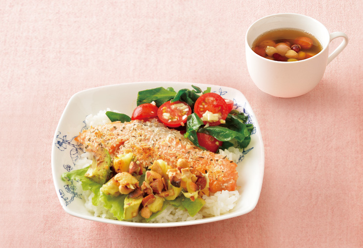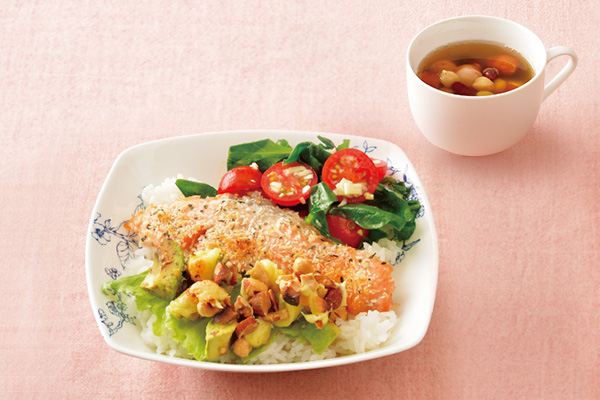 鮭やえごま油には美と健康に欠かせない必須脂肪酸のオメガ3の油が、アボカドはオメガ9の油が含まれています。このどんぶりで良質な油を摂り入れられます。