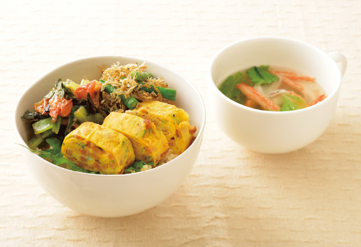 - 丼に玄米ご飯を入れ、卵焼きは青じその上にのせる。残りもそれぞれ盛りつける。