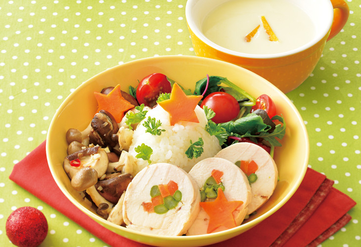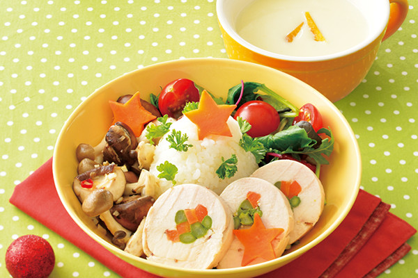 盛りつけを工夫するなど、少しのコツでどんぶりもちょっと豪華なおもてなし仕様に仕上がります。ラップを使ってご飯をツリー型に成形し、星型に切ったニンジンやパセリで彩りを足して。