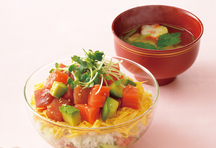 栄養バランスの整った和食“一汁三菜”を、ひとつの“どんぶり”と“お汁”で気軽に楽しむ『一汁多彩』。今回はおうちのひな祭りにパーティをかわいく演出する「どんぶりdeちらし寿司」をご紹介します。