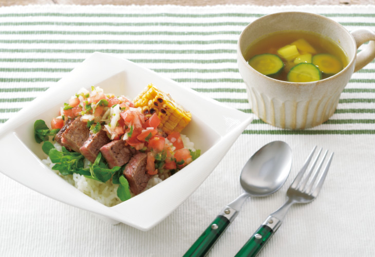 栄養バランスの整った和食“一汁三菜”を、ひとつの“どんぶり”と“お汁”で気軽に楽しむ『一汁多彩』。今回はボリュームたっぷりのステーキをヘルシーにいただく「サルサソースがけ牛ももステーキどんぶり」をご紹介します。