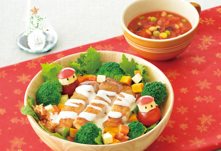 クリスマスにぴったりな、可愛いらしい洋風どんぶり。レンジで簡単に作れる米粉のホワイトソースと、ジューシーなチキンソテーがよく合う!リース型に盛りつけた温野菜やトマトで作るサンタなど、見た目も可愛い豪華などんぶりの完成です。