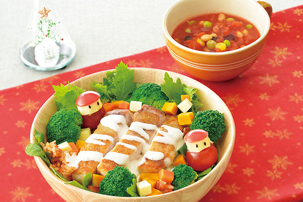 - チーズ入り温野菜サラダを作る。ブロッコリー、かぼちゃ、にんじんを同じ耐熱皿に重ならないように並べて軽くラップをし、電子レンジ(500w)で約2分半加熱する。飾りのトマトサンタは、ミニトマトの上1/3を切り、顔になるように切ったチーズをトマトではさみ、目は黒胡麻をつける。