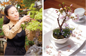 (右)柔らかく華やかな作風で、盆栽の魅力を伝える「彩花盆栽」