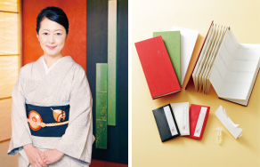 うらじ けいこ●衣食住ライフスタイル全般に精通し、商品の企画・開発・プロデュースに携わる。京都『裏具』で、個人指導のいけばな教室を主宰。著書多数。近著に『もの、好き。衣食住をセンスよく楽しむ心得』(講談社)。 (左)「装いも、相手への心づかい」と話す裏地さん。着物を着ると気持ちも引き締まるそう (右)裏地さんプロデュース、『裏具』の「吉帖」(上)とタイムフレグランス「間が香る」(下)