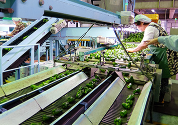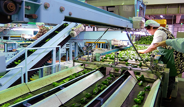 手作業や機械の重量計測で選別し、年間約8t(平成26年)ものピーマンが出荷される選果場