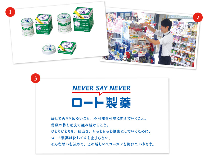 今年、ロート製薬では新しいコーポレート・アイデンティティ(CI)として、NEVER SAY NEVERを掲げました。「どんな困難に見えることでも、できないとは言わずチャレンジします!」という宣言でもあります。化粧品の分野も、当初は「そんな難しいことができるのだろうか」「門外漢のわれわれが本当に成功するのだろうか」という疑問や、とまどいは確かにありました。しかし、今までにないものであればこそ、チャレンジ精神を持った者がフロンティアを築けるんだ――という想いで、ここまで来られたように思います。これからも、社員全員で【NSN】の精神を発揮していきます!