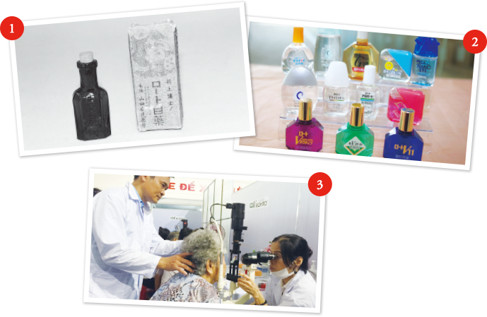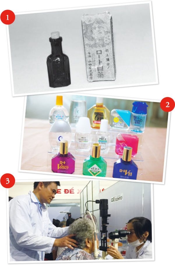 - 1909年に発売されたロート目薬。当時は、薬液を棒につけ目にたらすという方式でした。