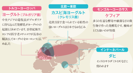 国際的には「ヨーグルトとは乳及び乳酸菌を原料とし、ブルガリア菌とサーモフィラス菌が大量に存在し、その発酵作用で作られた物」(1977 年WHO 制定)と定義されています。しかし日本では、もう少し広い意味で乳を発酵させたものをヨーグルトと呼んでいる場合もあります。ヨーグルトのような発酵乳は遊牧民を中心に古くから食べられてきたもので、世界各地に発酵乳を食べる習慣が残っています。
