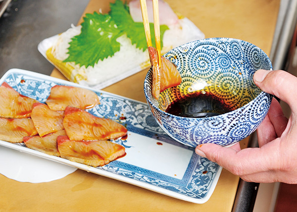 洗うことで魚が旨くなる。それがよくわかるのが刺身だね。焼けば香ばしさでにおいを隠すことができるけど、そのままを味わう刺身は、洗うという手当てがあるかないかで大きく変わってくる。柵なら、切る前に先ほどの手順で手当てを。パックの刺身の場合は、醤油で洗い流すのが有効(下を参照)。ひと切れずつ水洗いして拭くより、断然楽だ。醤油は塩分を含むので、塩と同様、表面に入り込んだにおいを吸い出してくれる。もちろん食べるときには醤油は不要。そのまま、わさびをのせてどうぞ。ぶりやかつおなど、青背の魚は、和辛子も合うよ。