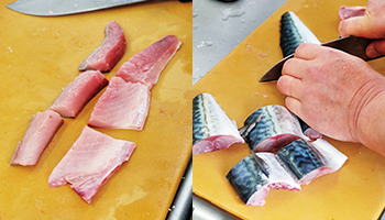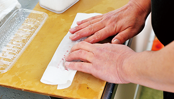 骨があるほうは使いにくい、という人は、最初に骨を取ってしまおう。腹骨に沿って包丁を入れ、そぐように切る。エラの骨が残っている場合もあるので、それも切り落としておく。骨を取ったら、「骨のないほう」の手順で作ろう