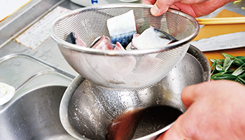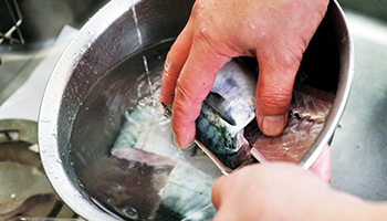 切った鯖をボウルの中で水洗いする。水を取り替えながら、水が澄んでくるまでしっかり洗う