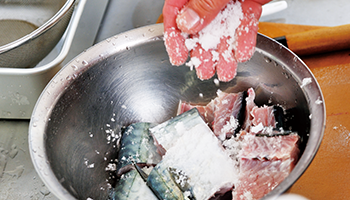 骨のあるほうは水を切って、骨のないほうはそのままボウルに入れる。鯖に塩を振り、全体的に塩がいきわたるように混ぜる。すり込まないように、和えるような感じで軽く混ぜる
