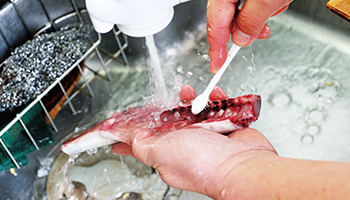 流水に当てて、全体を洗ったら、歯ブラシを使って骨の部分にある血を洗い流す