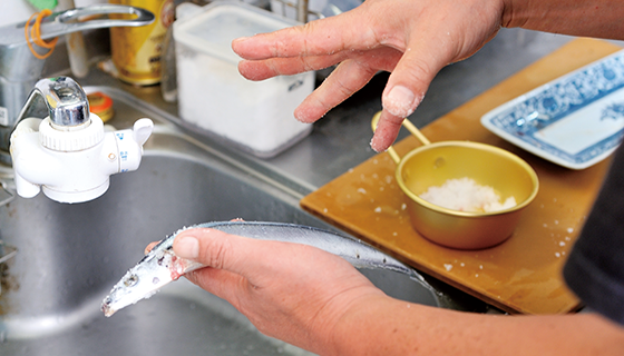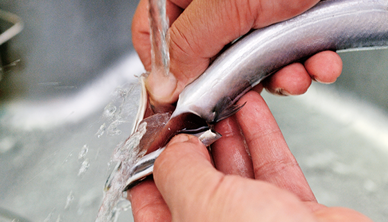 さんまの全体を洗い、特に血が溜まっているエラの部分をしっかり洗う。これだけで、においがかなり抑えられる。その後、拭いて水分を取る