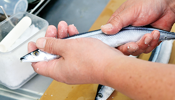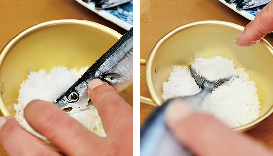 2回目の塩は、指ではじくように軽く全体に塩を当てる。二度塩をすることで、口に入れたときの力強い味わいとさんまの肉本来の味が際立ってくる(二段塩の方法と焼き方は下を参照)。