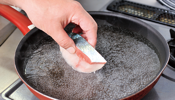 「湯煮」についてはこちらぶりの切り身をさっと洗って、水分を拭いたら、フライパンに沸かした湯に酒を入れ、ぶりを茹でる。時間は1分。このとき沸騰させないように注意しよう。沸騰させてしまうと、ぶりの旨味が湯のほうに逃げてしまうからだ。