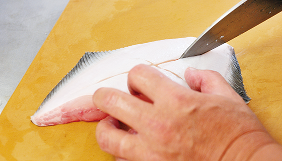 カレイを流水で洗い、水分を拭き取ったら、腹と背の両方に切り込みを入れる。包丁が骨に当たるまで深く切り込む