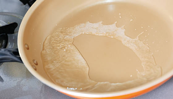 フライパンに酒を少し入れ、強火で沸騰させる。これで、カレイがフライパンにくっつくのを防げる