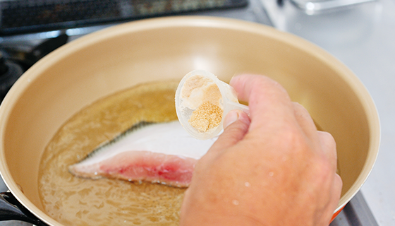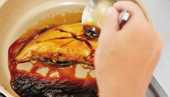 醤油とみりんを入れて仕上げていく際に、煮汁を魚に回しかけるんだけど、これは魚に味を入れていくための大切な作業。「煮物は、冷めるときに味が入る」というのと同じ原理だ。細胞は高温になるとふくらみ、温度が下がるとしぼむ。しぼむときに、素材が煮汁を吸い込んで味が入っていくんだ。魚に煮汁をかけた瞬間に細胞が熱せられてふくらみ、次の瞬間には温度が下がるから、それを繰り返すことで、どんどん味がしみ込んでいく。だから魚が煮汁につかっている必要はない。そして、忘れてはいけないのが、フライパンを火から下ろした後も、しばらく煮汁を回しかけ続けること。加熱を止めて温度が下がっていくときにも煮汁をかけることで、さらにしっかり味が入るんだ。