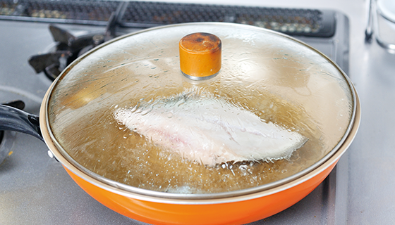 フライパンに蓋をして、中火で酒蒸しにする。カレイの身が浮いて中の骨が見えるようになったら、火が通ったサイン
